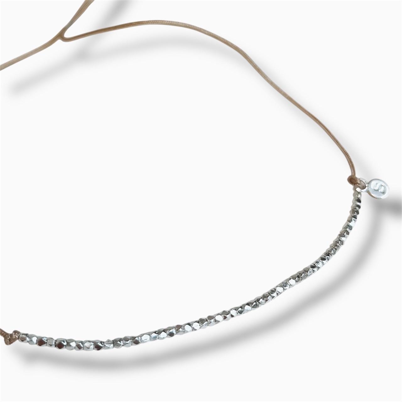 Double-wrapped nylon cord on which faceted 925 silver beads are slipped.