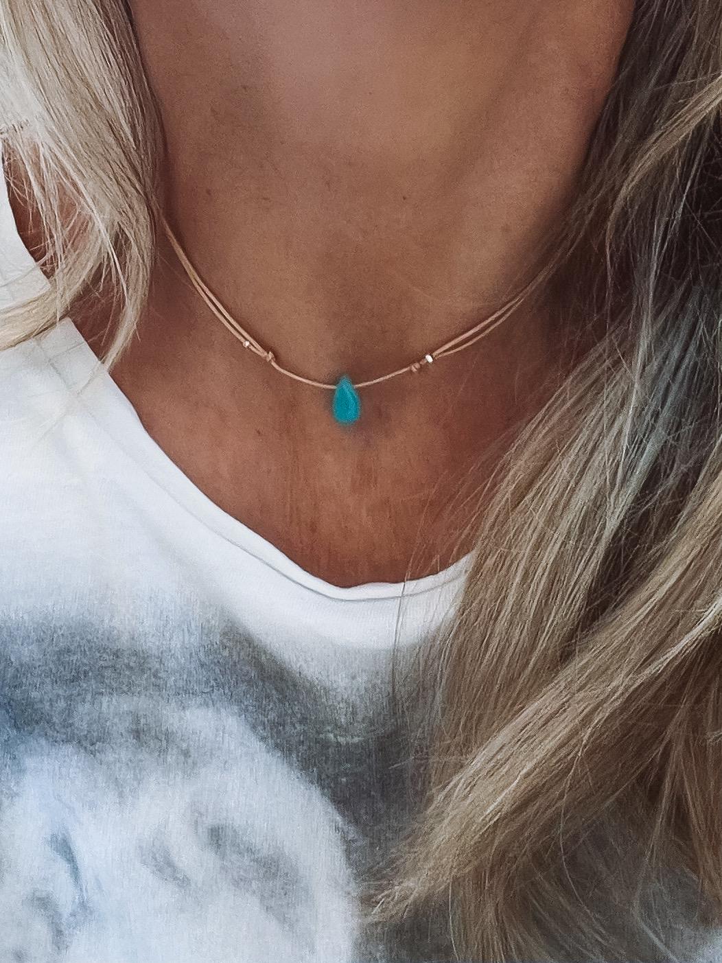 The necklace is made up of an adjustable nylon cord, available in 3 colors, to be discovered in the drop-down menu when ordering, a drop-shaped amazonite stone and small 925 silver beads. Thanks to its two sliding knots, the necklace adapts to all body shapes, ranging from 34 cm to 40 cm.