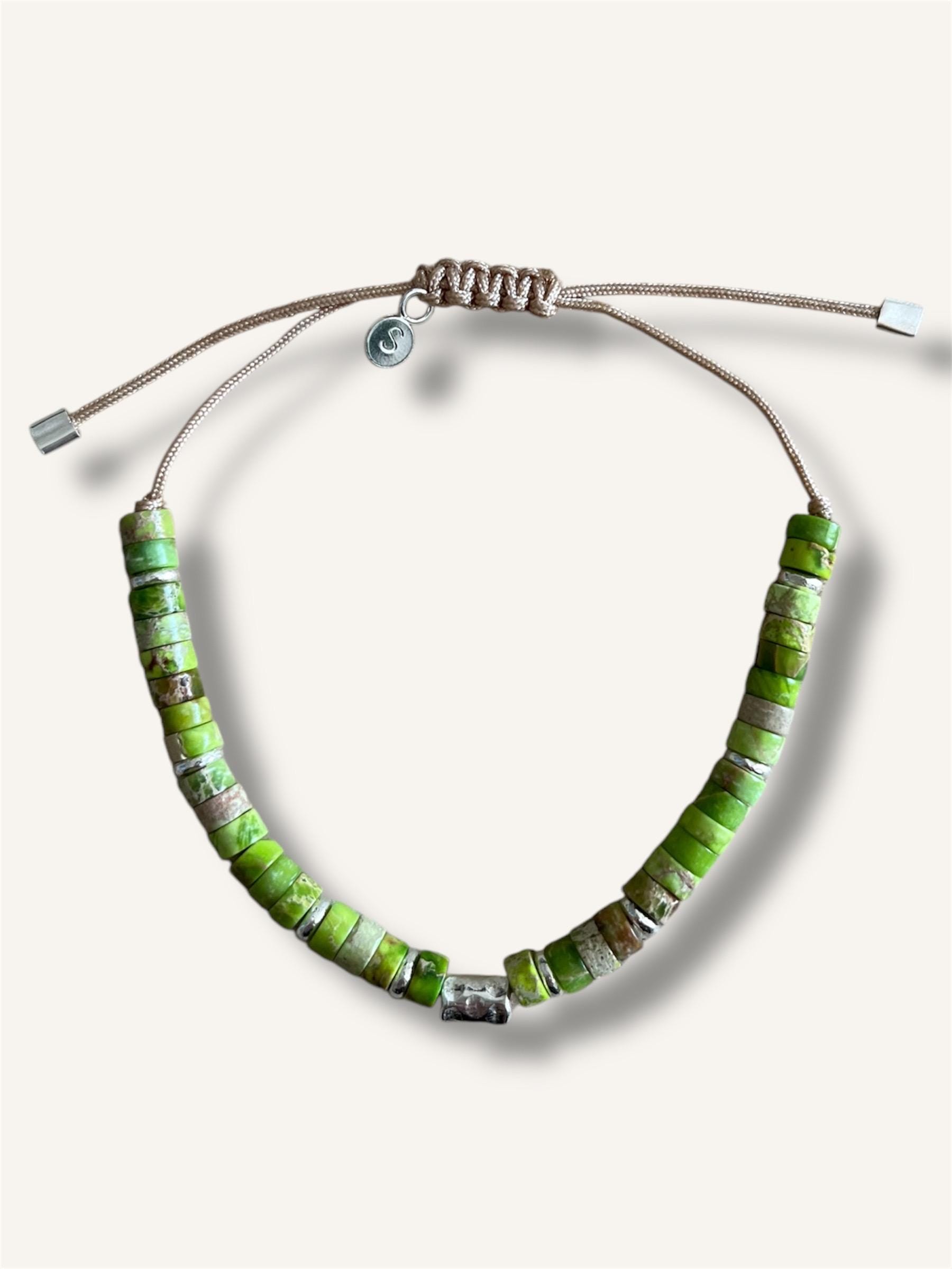 Turquoise sea sediment heishi beads, hammered 925 silver discs and central tubes.