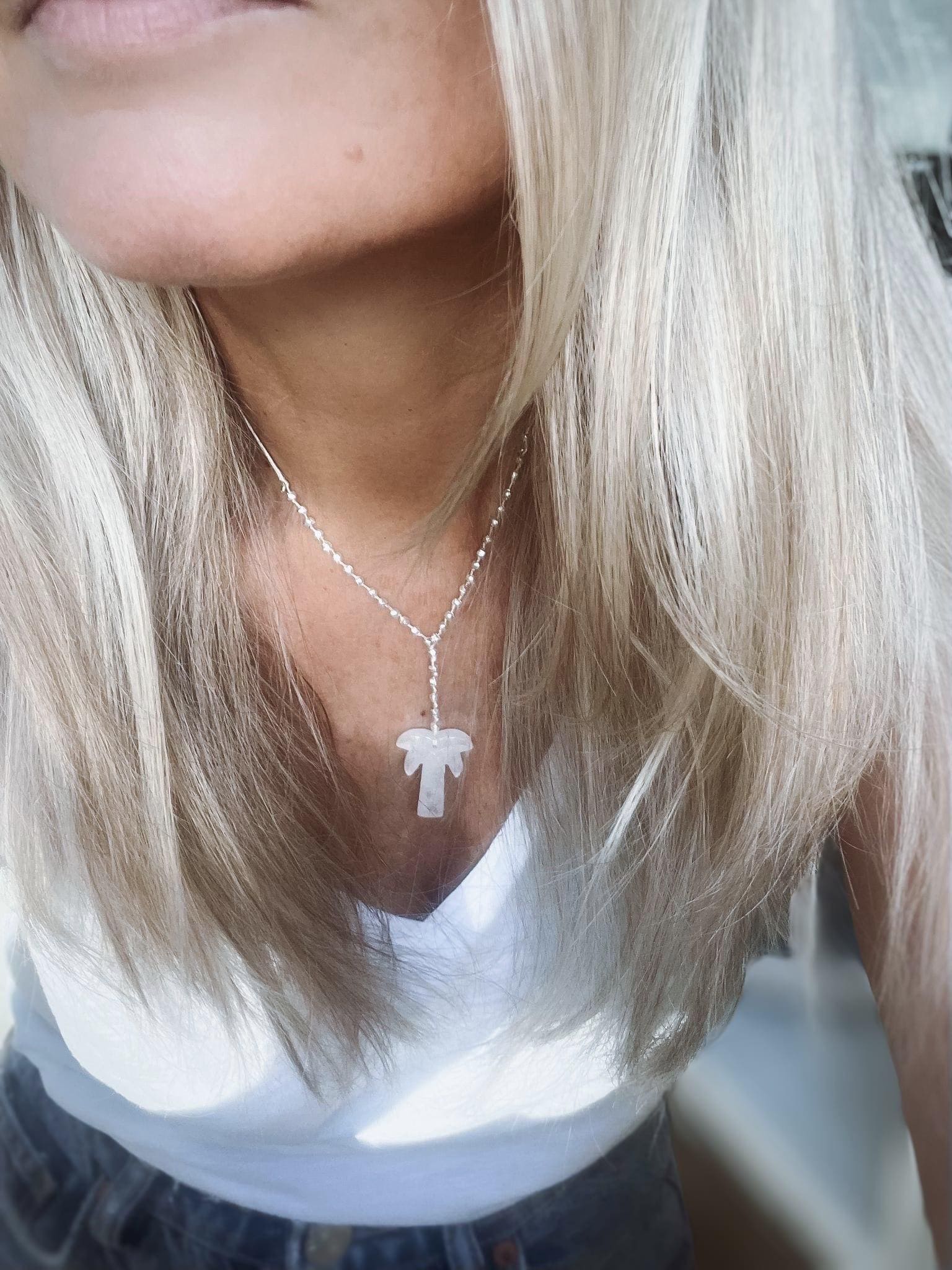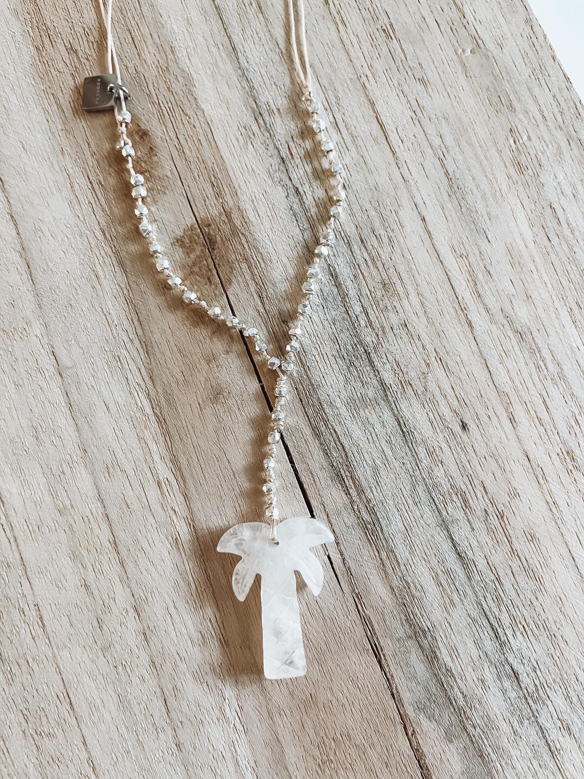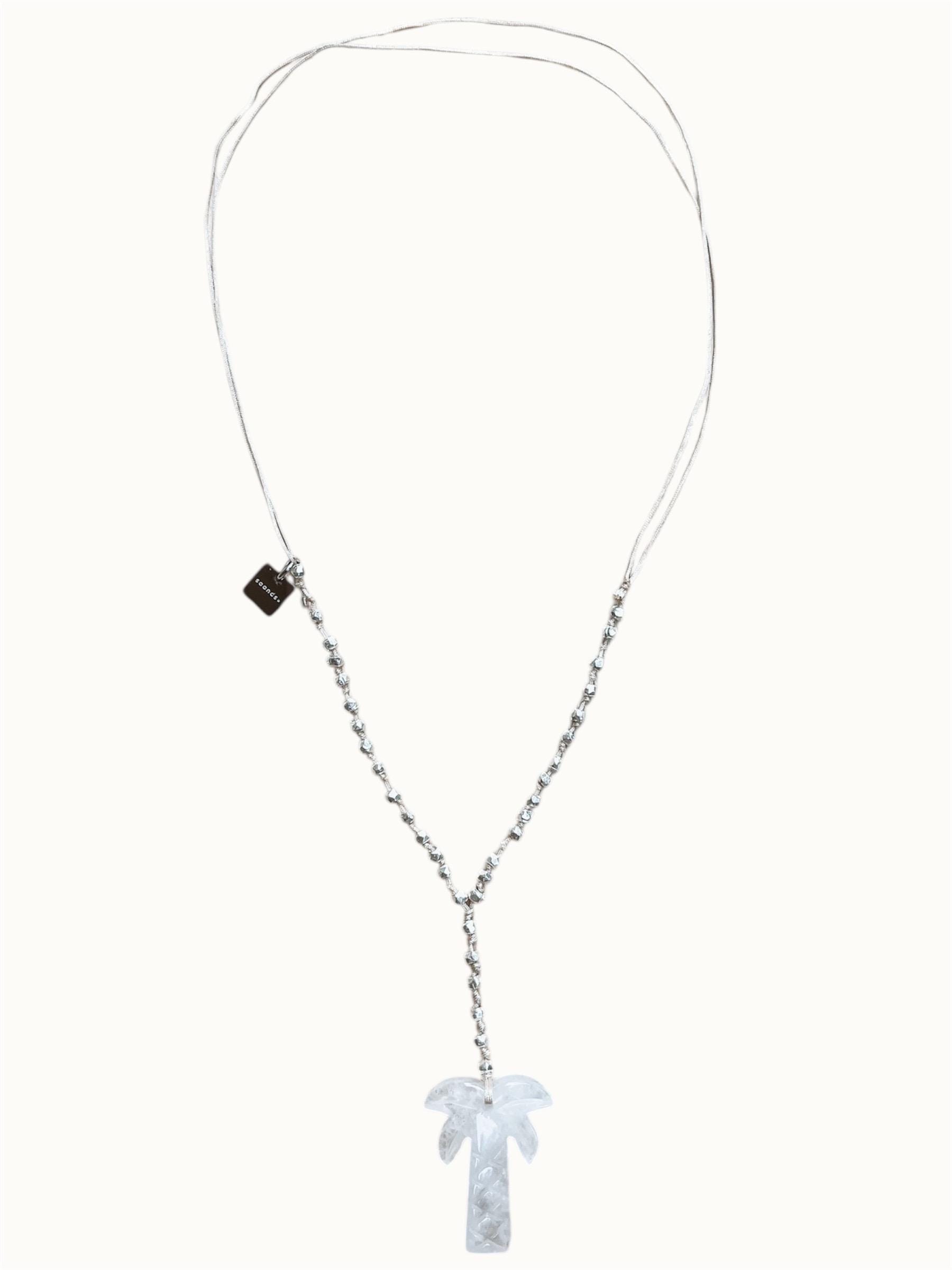 • Strong ecru-colored nylon thread • Faceted silver beads • Palm tree shaped pendant, in rose quartz.