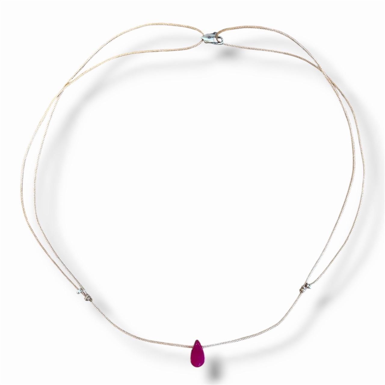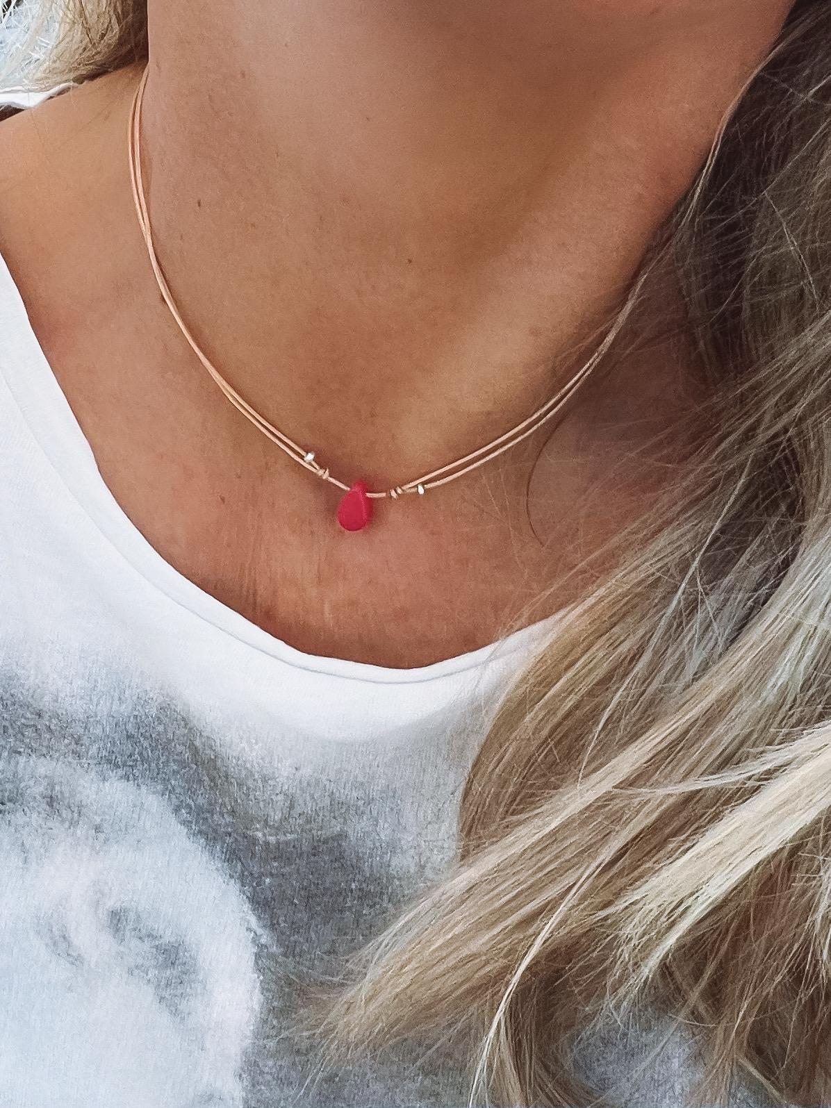 Choker is made of an adjustable nylon cord, available in 3 colors, to be discovered in the drop-down menu when ordering, tinted chalcedony stone in the shape of a drop and small 925 silver beads. Thanks to its two sliding knots, the necklace adapts to all body shapes, ranging from 34 cm to 40 cm.
